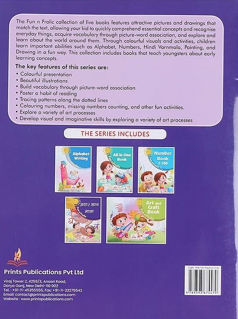 The Fun n Frolic collection of five books features attractive pictures and drawings that match the text, allowing your kid to quickly comprehend essential concepts and recognise everyday things, acquire vocabulary through picture-word association and explore and learn about the world around them. through colourful visuals and activities, children learn important abilities such as Alphabet, Numbers, Hindi Varnmala, Painting, and Drawing in a fun way. This collection includes books that teach youngsters about early learning concepts.