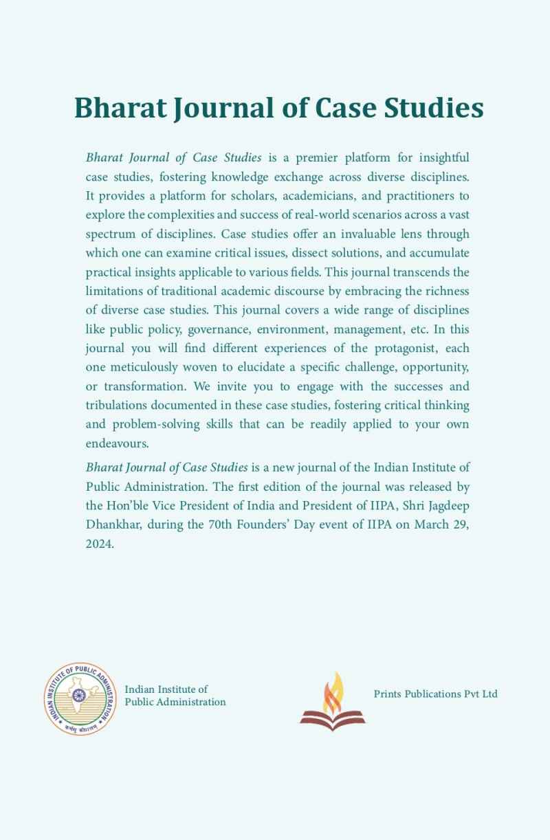 Bharat Journal of Case Studies is a premier platform for insightful case studies, fostering knowledge exchange across diverse disciplines. It provides a platform for scholars, academicians, and practitioners to explore the complexities and success of real-world scenarios across a vast spectrum of disciplines. Case studies offer an invaluable lens through which one can examine critical issues, dissect solutions, and accumulate practical insights applicable to various fields. This journal transcends the limitations of traditional academic discourse by embracing the richness of diverse case studies. This journal covers a wide range of disciplines like public policy, governance, environment, management, etc. In this journal you will find different experiences of the protagonist, each one meticulously woven to elucidate a specific challenge, opportunity, or transformation. We invite you to engage with the successes and tribulations documented in these case studies, fostering critical thinking and problem-solving skills that can be readily applied to your own endeavours.