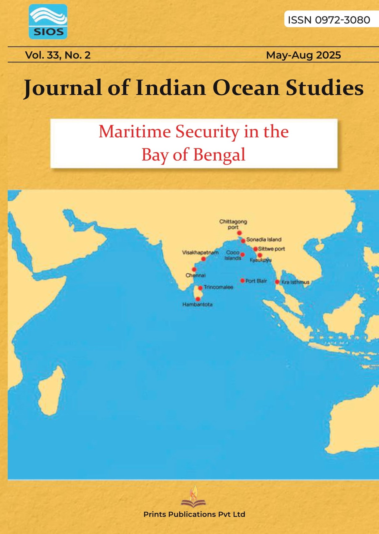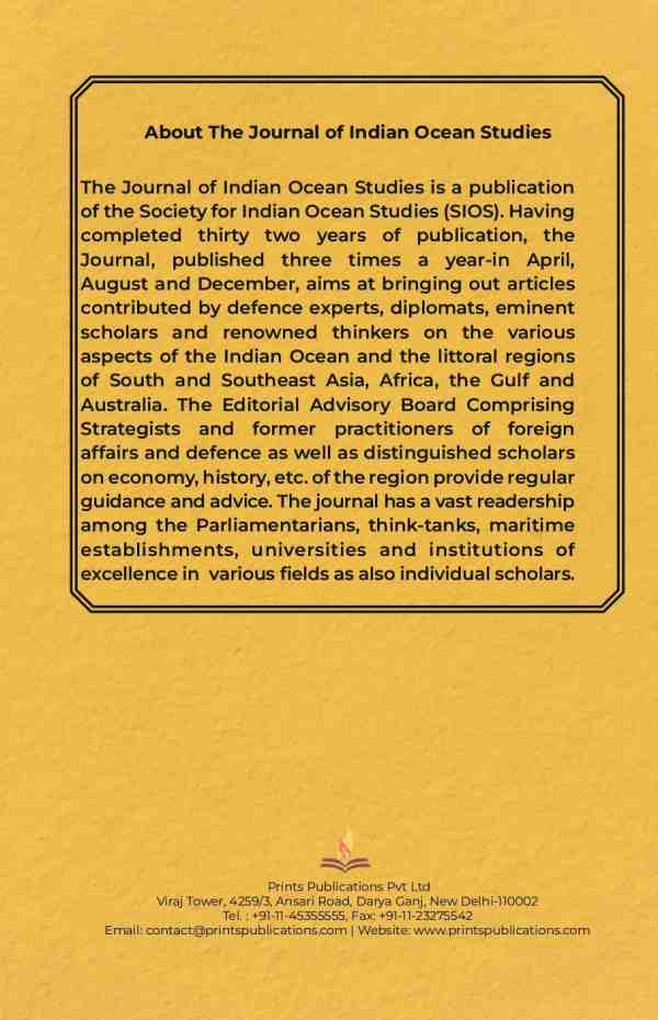 The Journal of Indian Ocean Studies is a publication of the Society for Indian Ocean Studies (SIOS). Having completed twenty-eight years of publication, the Journal, published three times a year-in January, May and September, aims at bringing out articles contributed by defence experts, diplomats, eminent scholars and renowned thinkers on the various aspects of the Indian Ocean and the littoral regions of South and Southeast Asia, Africa, the Gulf and Australia.